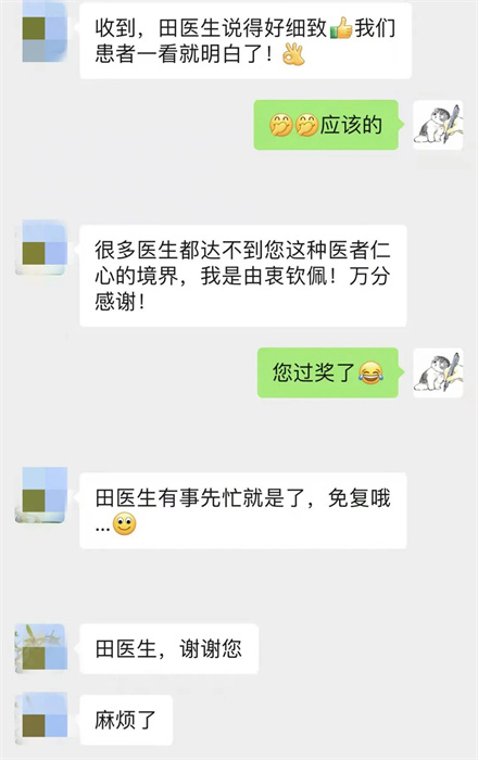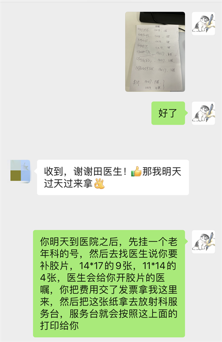 下班后,田小寶將劉女士要打印的片子錄入系統(tǒng),計算出張數(shù)和片子規(guī)格后,把需要打印的片子一一羅列出來,并拍照發(fā)給劉女士,同時,將補片的流程詳細地告知。“現(xiàn)在提倡用電子膠片,患者一般有需要才會取傳統(tǒng)膠片,所以對取片的流程不熟悉。”田小寶的幫助,為劉女士減少了奔波取片的時間?!疤镝t(yī)生,謝謝您?!表樌∑?,劉女士特地通過微信表達感謝。