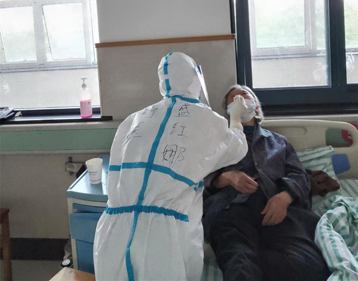觀察患者病情,配合醫(yī)生治療,照顧患者的生活起居……是盛紅娜在隔離病房的主要護理工作。5月4日晚,盛紅娜正準(zhǔn)備下班,當(dāng)?shù)弥綦x病房內(nèi)一位89歲的老人疑似心梗,需要護理人員24小時特護時,“我來!”盛紅娜毫不猶豫“接班”,這一天,她持續(xù)工作了9個小時。