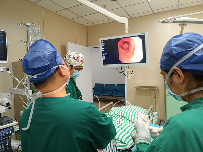 我院呼吸與危重癥醫(yī)學(xué)科副主任醫(yī)師盛建輝查看影像后,發(fā)現(xiàn)祝爺爺左主氣管內(nèi)有高密度影,考慮是此前的嗆咳導(dǎo)致異物進(jìn)入氣管。在麻醉科、內(nèi)鏡中心醫(yī)護(hù)的配合下,盛建輝為祝爺爺緊急施行“支氣管鏡+異物取出術(shù)”。