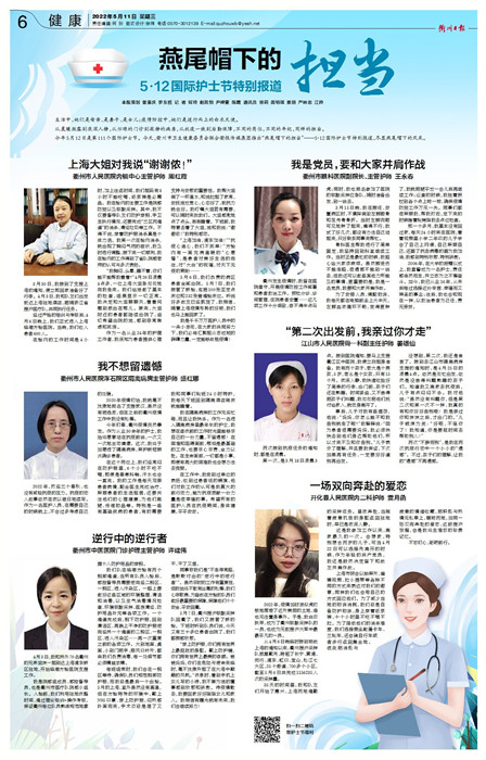 今年5月12日是第111個國際護士節(jié)。今天,衢州市衛(wèi)生健康委員會聯(lián)合衢報傳媒集團推出“燕尾帽下的擔(dān)當(dāng)”——5·12國際護士節(jié)特別報道,盡顯燕尾帽下的風(fēng)采。