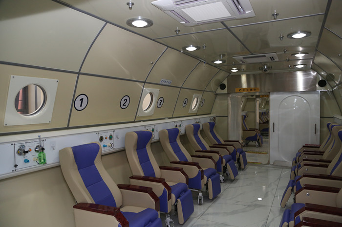 目前,我院高壓氧治療中心擁有浙西地區(qū)規(guī)模最大的艙群,艙體長(zhǎng) 17.6 米,直徑3.2米,由兩個(gè)10座治療艙和一個(gè)過(guò)渡艙組成,空間寬敞舒適。輪椅、平床可以輕松進(jìn)入。氧艙采用先進(jìn)的微阻力緩沖式供排氧技術(shù),每個(gè)艙室裝有2個(gè)攝像頭,可全方位觀察艙內(nèi)病人動(dòng)態(tài)變化,艙內(nèi)每個(gè)座位設(shè)有一級(jí)無(wú)阻力供氧和負(fù)壓吸痰裝置。