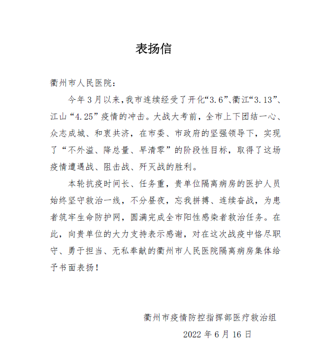 日前,我院收到了一封來自衢州市疫情防控指揮部醫(yī)療救治組的感謝信,為我院在此次疫情大考中忘我拼搏、主動擔當?shù)木珰馍顸c贊。