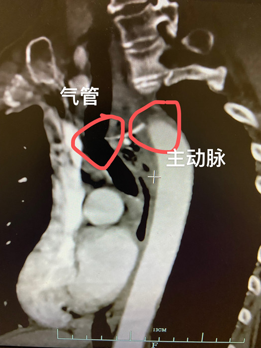 原來(lái),被卡住的是兩根骨頭,其中一根骨頭的兩端緊挨主動(dòng)脈壁,距離主動(dòng)脈壁僅1毫米左右,另一塊骨頭頂在肺支氣管上。
