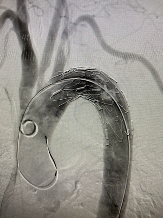 “如果內(nèi)鏡下直接取出異物容易造成患者二次損傷,刺向胸主動(dòng)脈的鴨骨頭最為尖銳,距離主動(dòng)脈壁最近,一旦刺破可引發(fā)致命性大出血?!苯?jīng)消化內(nèi)科、血管外科、心胸外科、放射科、麻醉科等科室緊急會(huì)診,決定為劉奶奶先行胸主動(dòng)脈支架術(shù),后在內(nèi)鏡下行食管異物取出術(shù)。