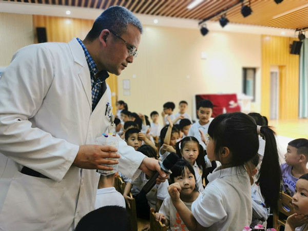 活動現(xiàn)場,鄭志剛展示眼球模型,結(jié)合小朋友生活學(xué)習(xí)習(xí)慣,深入淺出地講解“近視危害”、“近視發(fā)生的因素”、“如何養(yǎng)成用眼好習(xí)慣”。
