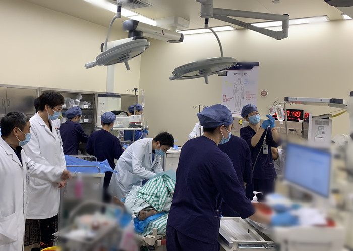 “馬上準(zhǔn)備好搶救設(shè)備、藥物,請放射科、超聲科準(zhǔn)備就位……”外科醫(yī)療總值班和急診科護士長分工部署、密切配合。