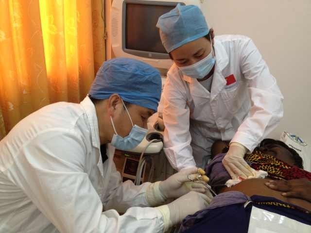 我院超聲科陳曉華醫(yī)生與隊(duì)友一起為患者做超聲介入治療
