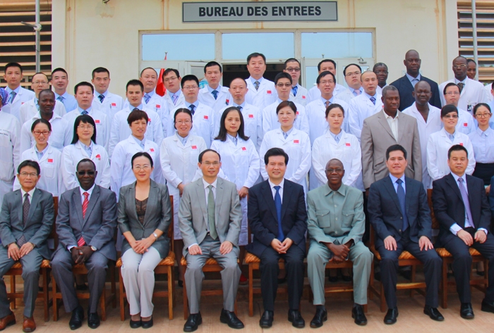 特使與全體隊(duì)員合影(第一排右四:王正偉特使;第一排右五:曹忠明大使;第一排右三:馬里衛(wèi)生部秘書(shū)長(zhǎng))