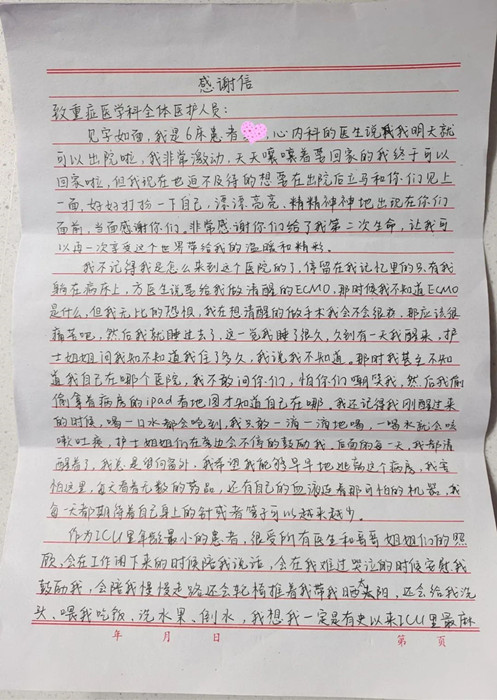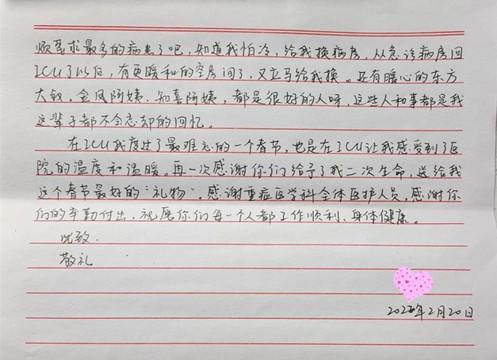 “感謝你們給了我第二次生命,讓我可以再一次感受這個世界帶給我的溫暖和精彩……”2月24日上午,我院重癥醫(yī)學(xué)科(ICU)收到一封來自江西玉山的感謝信。