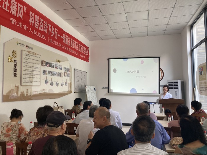 為樹立良好的健康觀念,指導(dǎo)居民認(rèn)識慢病、管理慢病,7月22日下午,由我院藥學(xué)部主辦的“關(guān)注痛風(fēng)”科普活動,在新新街道彩虹社區(qū)會議室舉行。