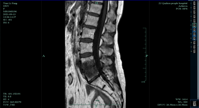 在家人的陪同下,田大嬸來到我院,感染科陳曉春醫(yī)生建議行磁共振檢查,檢查結果提示“腰4、5椎體異常信號影伴椎旁及腰大肌內側軟組織腫脹,以椎體結核伴周圍寒性膿瘍形成首先考慮;腰椎退行性變;腰1/2、腰4/5椎間盤膨出;骶管囊腫?!?span>