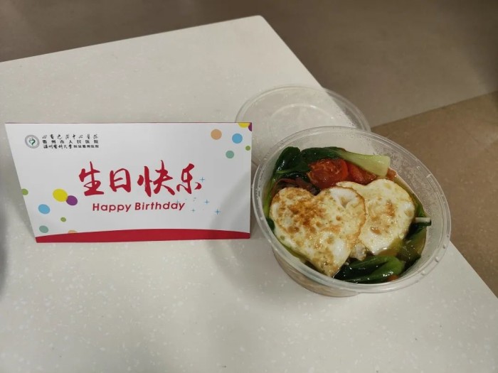 “我們醫(yī)院營(yíng)養(yǎng)廚房為您送上長(zhǎng)壽面。”2月6日中午,我院腫瘤內(nèi)科護(hù)士長(zhǎng)姜美青與責(zé)任護(hù)士繆淑琴來到患者管大叔的身邊,送上生日祝福與溫暖。