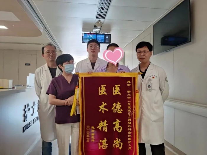 患者停藥休息1個(gè)月后,行胃癌根治術(shù)(全胃切除+roux-y吻合術(shù)),4個(gè)小時(shí)后手術(shù)順利完成。術(shù)后老徐恢復(fù)良好,與家人特地送來(lái)錦旗感謝胃外科醫(yī)護(hù)團(tuán)隊(duì)。
