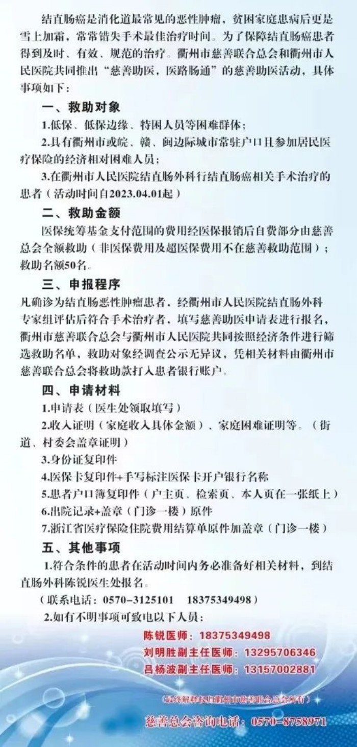 今年,衢州市慈善聯(lián)合總會(huì)與衢州市人民醫(yī)院共同推出“慈善助醫(yī),‘醫(yī)’路‘腸’通”活動(dòng),專門為困難患者提供幫助。