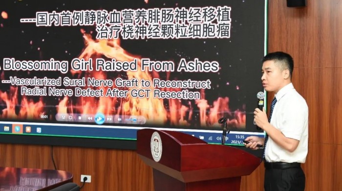 我院創(chuàng)面修復(fù)科執(zhí)行主任卓高豹以國內(nèi)首例橈神經(jīng)顆粒細胞瘤手術(shù)參賽,患者系上臂橈神經(jīng)顆粒細胞瘤外院術(shù)后復(fù)發(fā),病例罕見、手術(shù)難度極大、神經(jīng)功能恢復(fù)困難。手術(shù)團隊成功切除腫瘤并創(chuàng)新性地采用小隱靜脈靜脈化腓腸神經(jīng)移植修復(fù)神經(jīng)缺損。術(shù)后隨訪7年,患者神經(jīng)功能完全恢復(fù),腫瘤無復(fù)發(fā)。