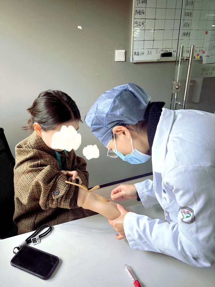 消化內(nèi)科護士周敏慧接單后,前往鄭女士的工作地點為其現(xiàn)場采血,憑借熟練的操作手法、熱情的服務態(tài)度,周敏慧很快為鄭女士完成采血,并講解采血后注意事項,得到鄭女士稱贊。