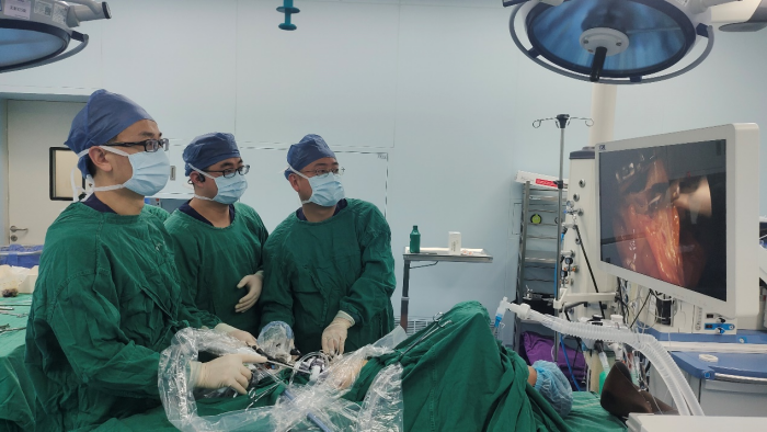 術(shù)中,沈賢教授邊手術(shù)邊講解關(guān)鍵點(diǎn)?!笆中g(shù)不能單純考慮切除病灶,還要預(yù)見到患者術(shù)后的生活質(zhì)量?!泵恳徊骄艿牟僮鞫紟е鴿夂竦娜宋年P(guān)懷。在手術(shù)室、麻醉科的全力配合下,成功完成此例微創(chuàng)手術(shù)。