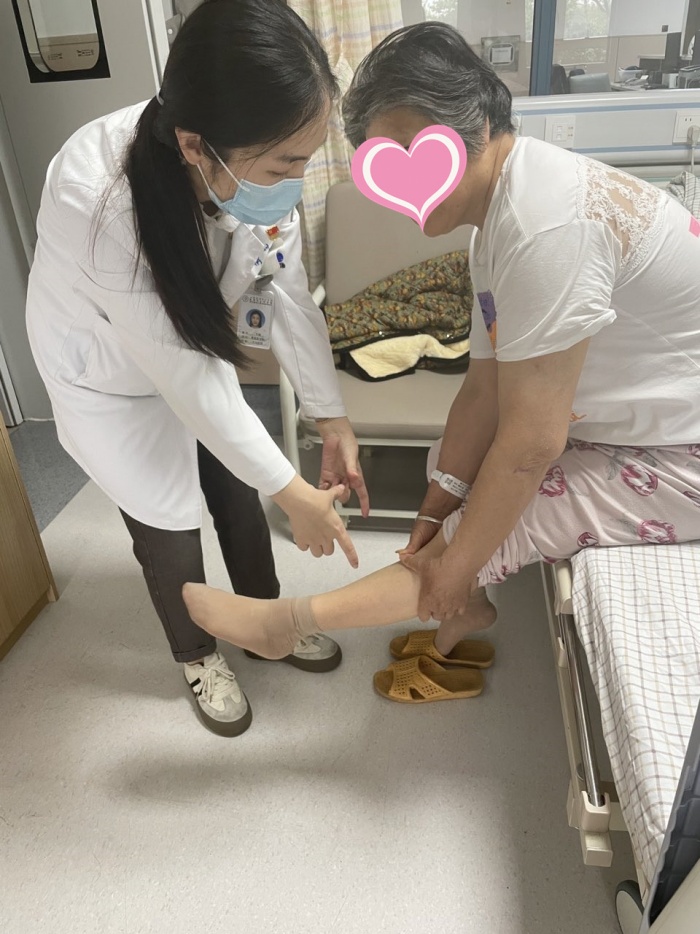 康復醫(yī)學科于娟醫(yī)生接診后發(fā)現(xiàn),徐大媽扭傷的左踝有輕度腫脹,活動受限。同時發(fā)現(xiàn)徐大媽腿部的肌肉松垮,用拇指、食指圍一圈,正好圍上。