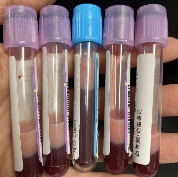 當護士為她抽血做進一步檢測時,發(fā)現(xiàn)抽出來的血并不是鮮紅色,而像摻了牛奶一樣,變成粉色。