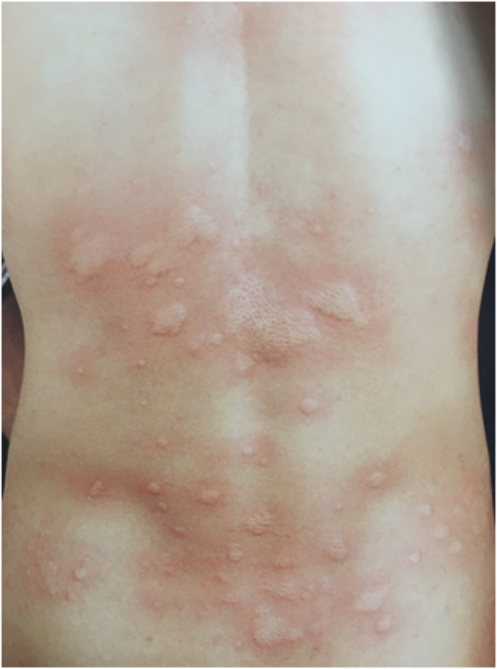 皮膚疹子:通常為紅色、隆起的疹子或斑塊,可能會在皮膚上呈現(xiàn)不規(guī)則形狀,大小不一。