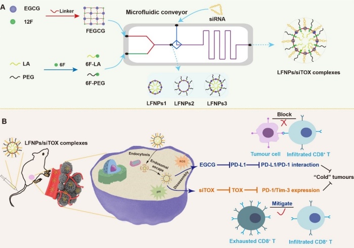 免疫檢查點抑制劑(Immune checkpoint inhibitors, ICIs)的應用,為癌癥治療提供了一種變革性的治療手段。ICIs能夠通過靶向細胞程序性死亡蛋白1及其配體1(PD-1/PD-L1)通路,激活免疫系統(tǒng)而有效地抑制腫瘤發(fā)展。然而,T細胞耗竭仍然是限制ICIs治療效果的主要瓶頸,研究團隊基于茶多酚EGCG為底物,通過微流控技術構(gòu)建了新型siRNA納米遞送體系。其中,LFNPs3-3/siTOX納米復合物具備最優(yōu)越的siRNA遞送效率。研究表明,其可以有效降低腫瘤細胞PD-L1的表達,并逆轉(zhuǎn)CD8+T細胞的耗竭,最終激發(fā)機體產(chǎn)生強大的免疫能力。