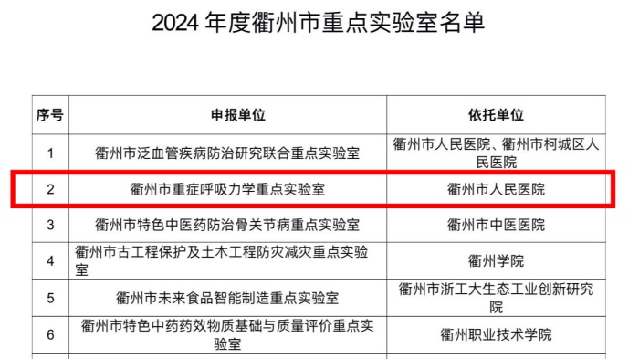 近日,衢州市科技局公布了2024年重點(diǎn)實(shí)驗室項目名單,由我院重癥醫(yī)學(xué)科張偉文主任醫(yī)師及王丹瓊副主任醫(yī)師牽頭申報的“衢州市重癥呼吸力學(xué)重點(diǎn)實(shí)驗室”成功獲批,該實(shí)驗室也是衢州首個重癥呼吸力學(xué)實(shí)驗室。