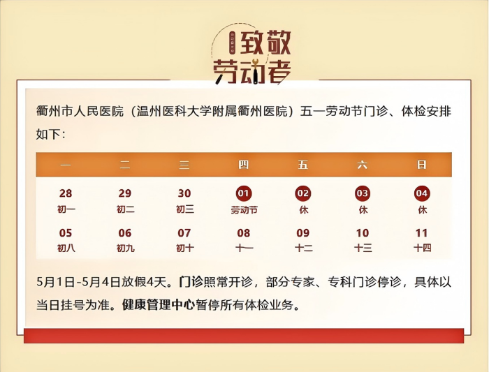 衢州市人民醫(yī)院2025年勞動(dòng)節(jié)門診安排 文章來源:門診部 作者: 點(diǎn)擊數(shù):1334 更新時(shí)間:2025-04-23 上一篇: 衢州市人民醫(yī)院PET/CT檢查公示(2025.4.17-2025.4.23) 下一篇: 我院浮石院區(qū)康復(fù)理療科新開設(shè)頸肩腰腿痛門診