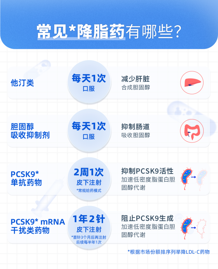 改善生活習(xí)慣1-3個月后,血脂水平仍“居高不下”,就要考慮用藥物進入體內(nèi)與斑塊“斗爭”。藥物可以幫助長久平穩(wěn)控制血脂,對延緩斑塊堆積有更顯著的效果。