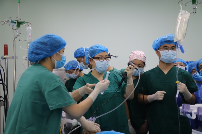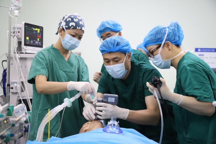 方向宇采用“鎮(zhèn)靜鎮(zhèn)痛,保留自主呼吸,喉罩輔助,必要時插管”的精細(xì)麻醉方案,為手術(shù)安全筑起第一道防線。隨后,金旭如開始實施氣管鏡下探查,過程中患者幾度氧飽和度下降,由于術(shù)前預(yù)案充分,化險為夷。