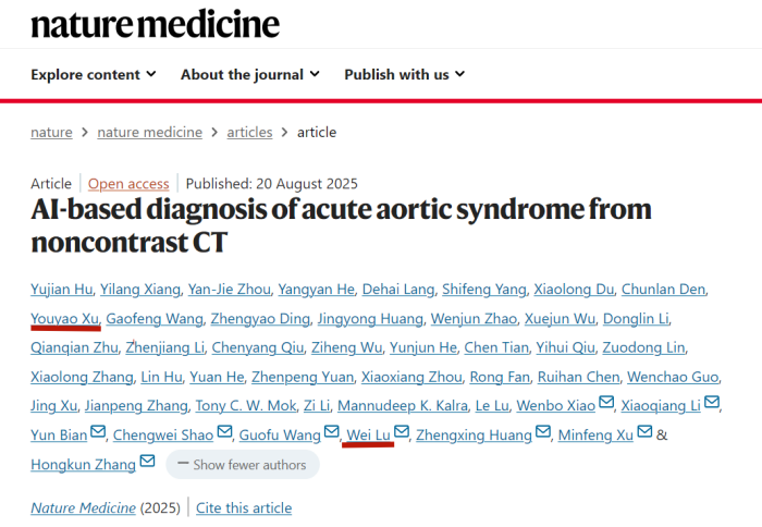 日前,全球頂尖醫(yī)學期刊《Nature Medicine》在線發(fā)表了一項關于急性主動脈綜合征(AAS)人工智能診斷的重要研究成果——《AI-based diagnosis of acute aortic syndrome from noncontrast CT》。我院血管外科作為核心參與單位之一,黨委委員、副院長陸煒作為共同通訊作者,為本研究提供了重要臨床數據與技術支持。