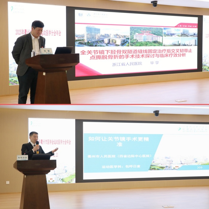 浙江省人民醫(yī)院骨科主任、運(yùn)動(dòng)醫(yī)學(xué)科畢擎教授作《構(gòu)建“預(yù)防—治療—康復(fù)”一體化全民健康促進(jìn)網(wǎng)絡(luò)》主旨報(bào)告,強(qiáng)調(diào)運(yùn)動(dòng)健康全流程管理的重要性,提出建立多學(xué)科協(xié)作機(jī)制、提供個(gè)性化服務(wù)的發(fā)展方向。衢州市醫(yī)學(xué)會(huì)運(yùn)動(dòng)醫(yī)學(xué)分會(huì)主委、我院運(yùn)動(dòng)醫(yī)學(xué)科主任包呼日查分享了《術(shù)前三維CT規(guī)劃設(shè)計(jì)在關(guān)節(jié)鏡手術(shù)中的應(yīng)用》,聚焦手術(shù)精準(zhǔn)化方案制定,為提升手術(shù)成功率、降低并發(fā)癥提供實(shí)踐思路。